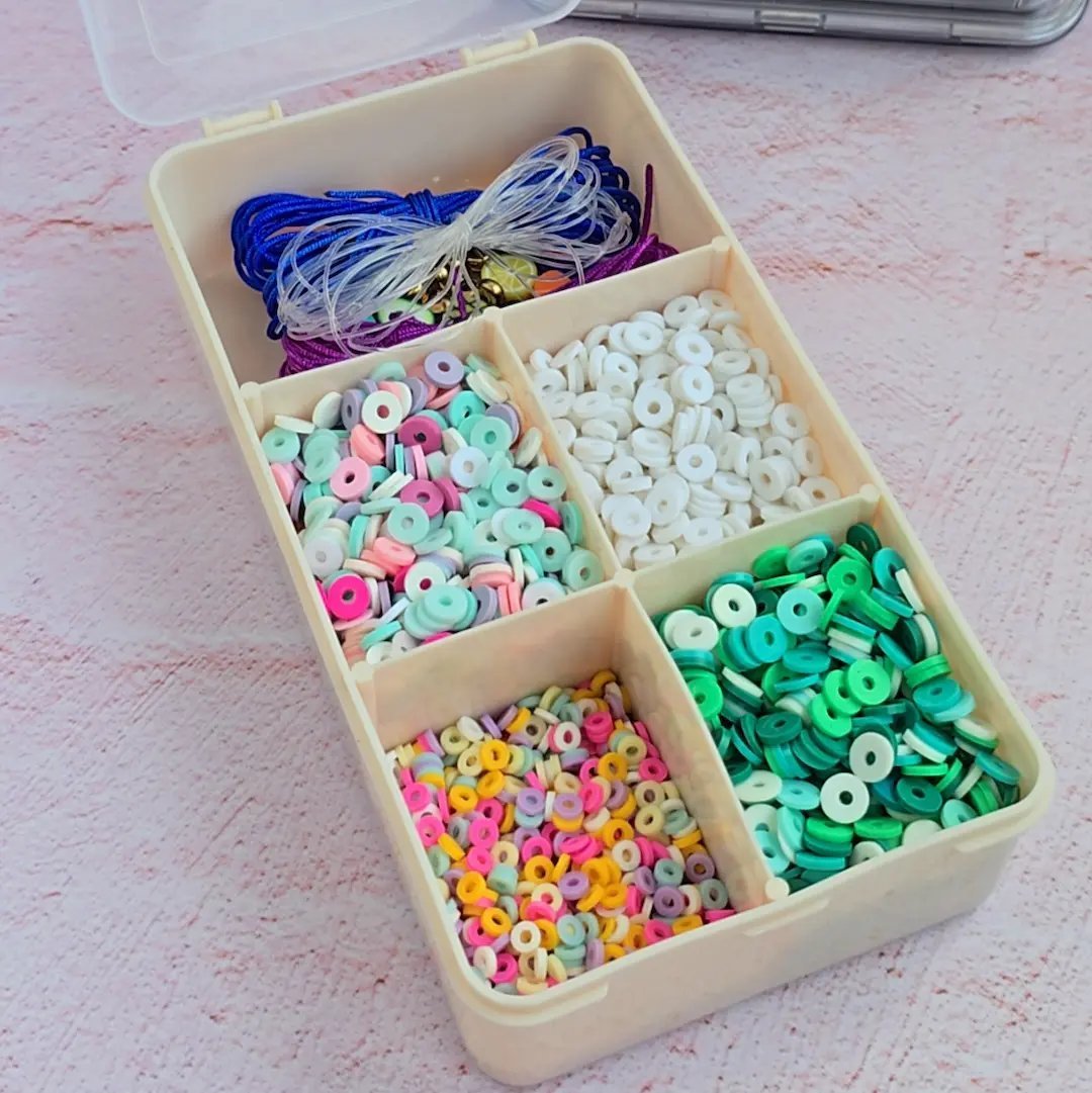 Contiene: hilo de colores, tanza elastizada, variedad de cuentas, y discos de fimo blanco, verde degrade, multicolor pastel y  multicolor mini, para dar rienda a la imaginación.