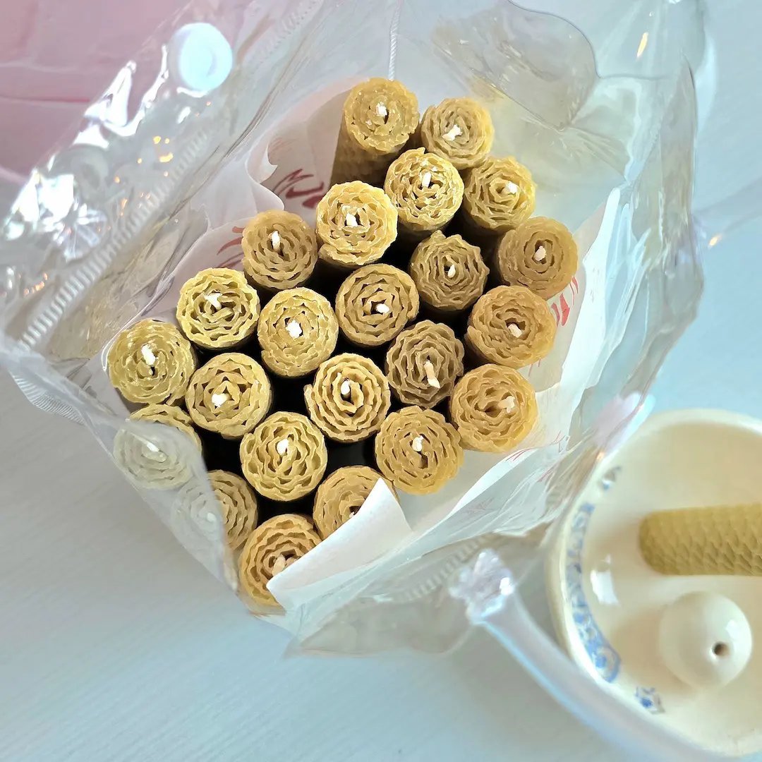 El pack contiene 24 velas de miel y platito de cerámica con porta incienso.